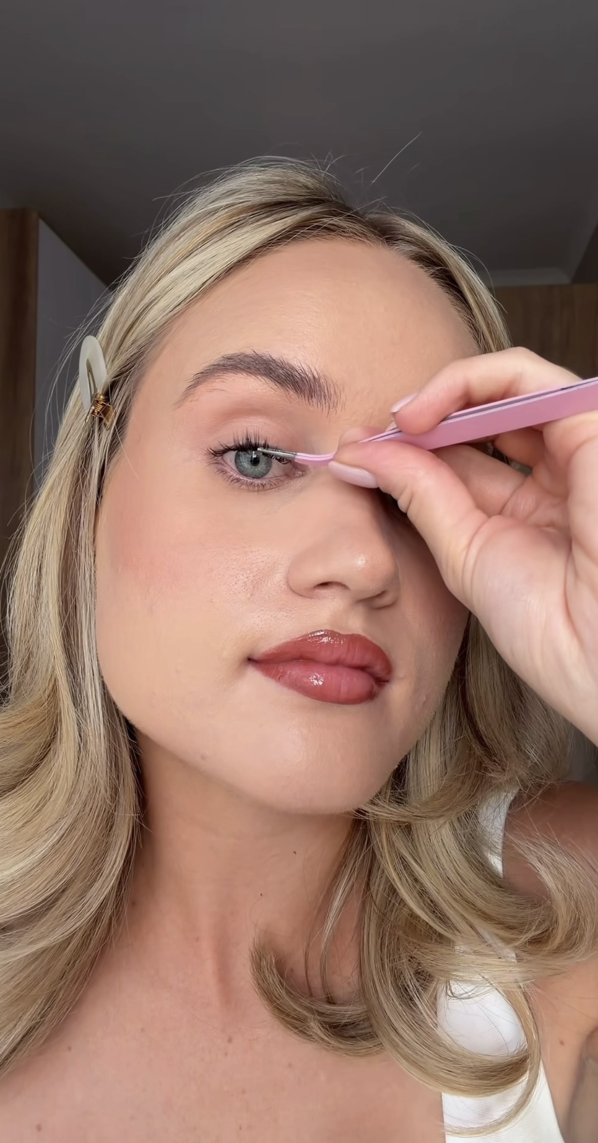 Apply light coat of lash adhesive underneath the base of natural lashes. Concentrating near the roots, 1mm away from waterline. For extra hold apply a light coat of lash adhesive on the lash band.